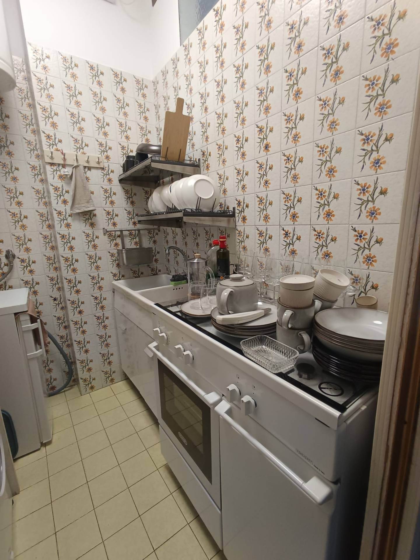 The kitchenette-style kitchen is fully equipped with a gas stove, oven, refrigerator, and freezer.