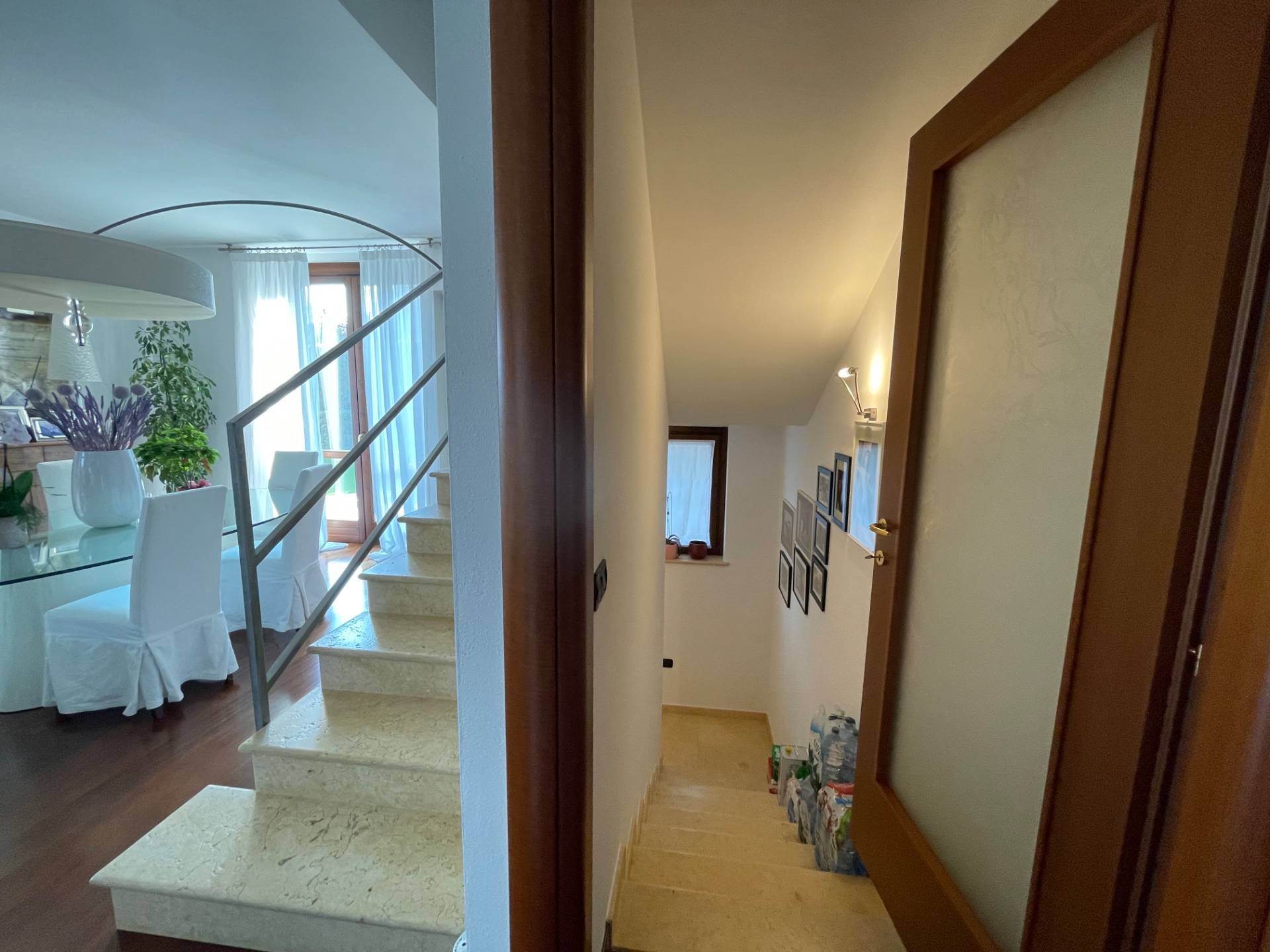 On the ground floor is a bright living room with dining area and direct access to the porch for outdoor relaxation, an eat-in kitchen, a guest bathroom, and the first bedroom on the first floor.