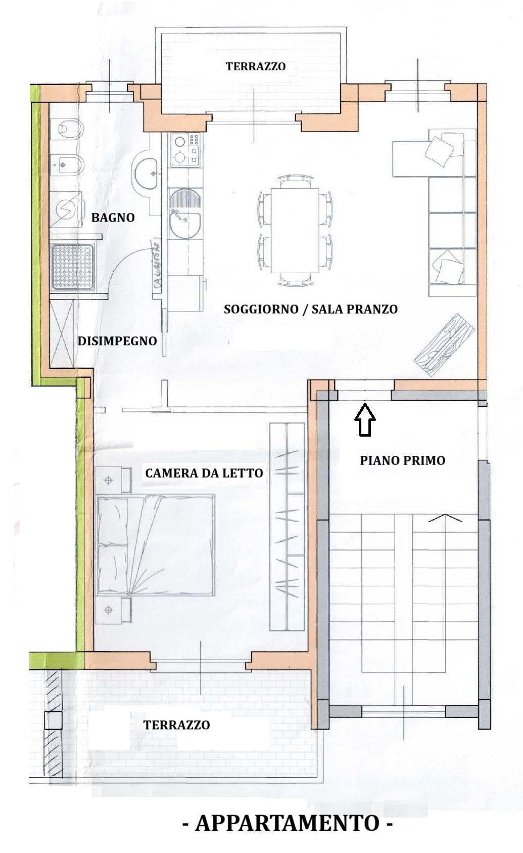 The approximately 65 sq m apartment opens onto a bright living room with an open-plan kitchen, a spacious and harmonious space with direct access to the livable terrace. The sleeping area comprises a hallway, a spacious double bedroom overlooking the second terrace, and a beautifully finished bathroom with a window.